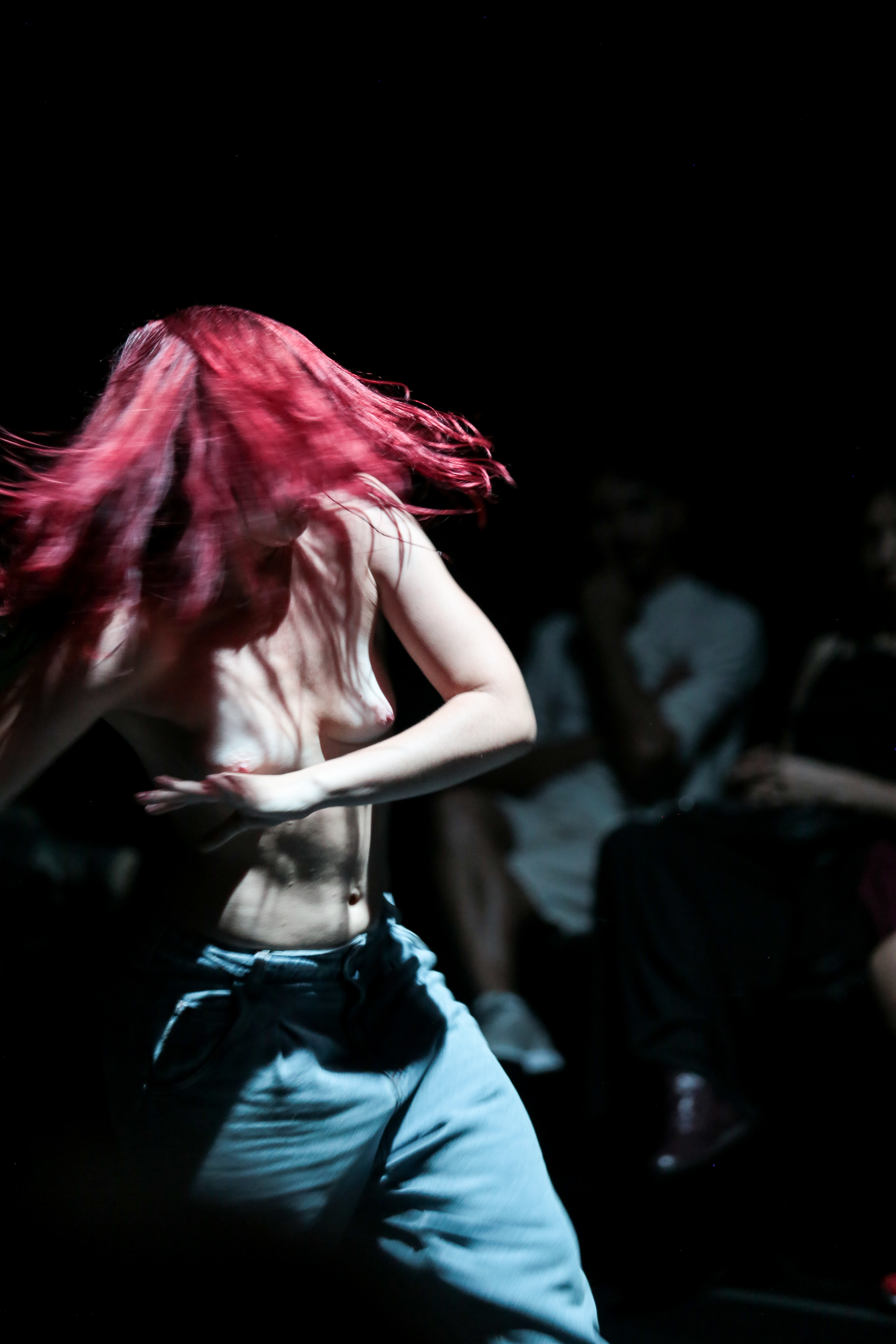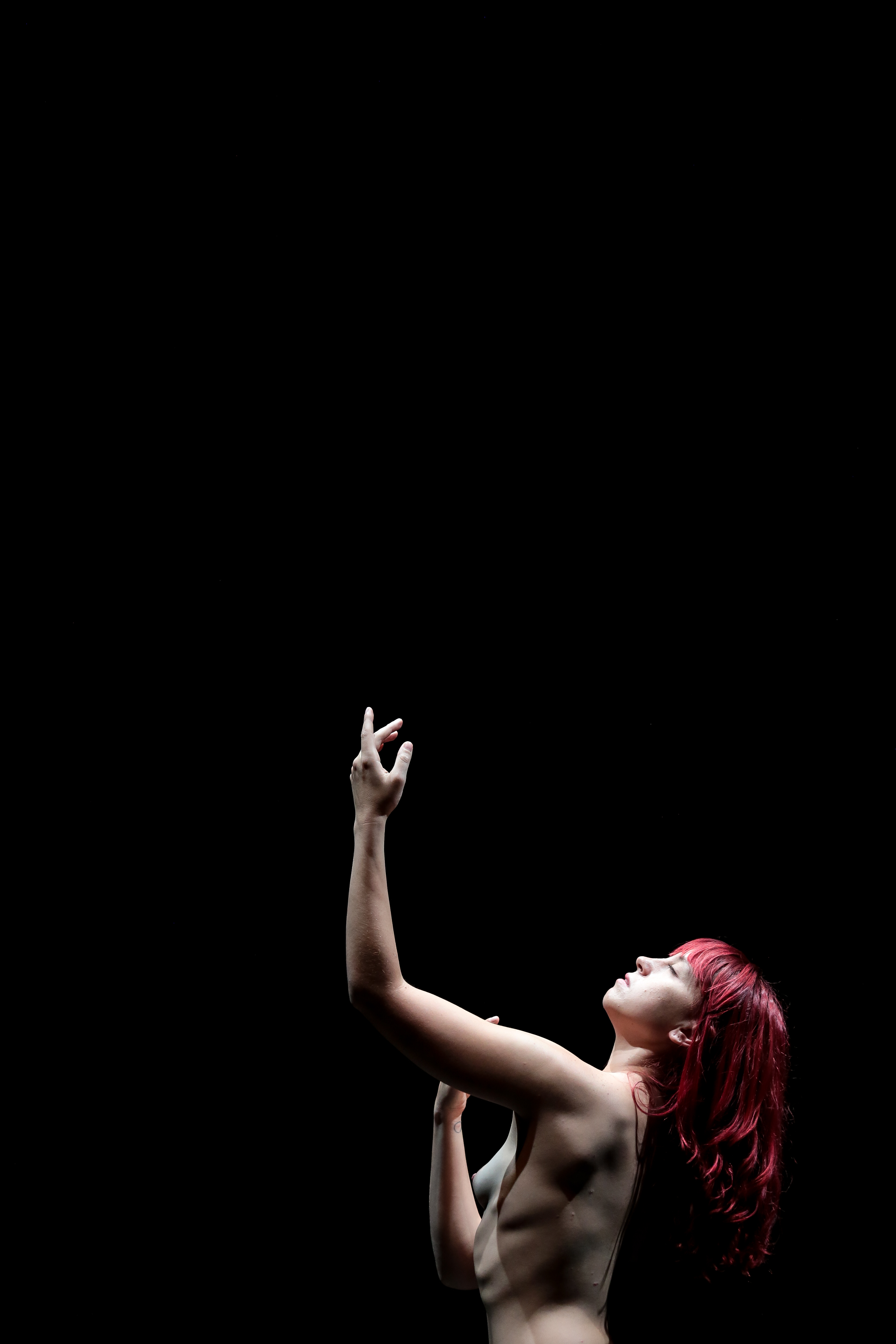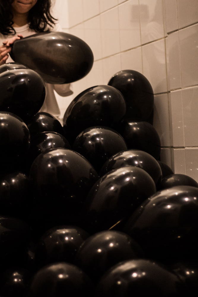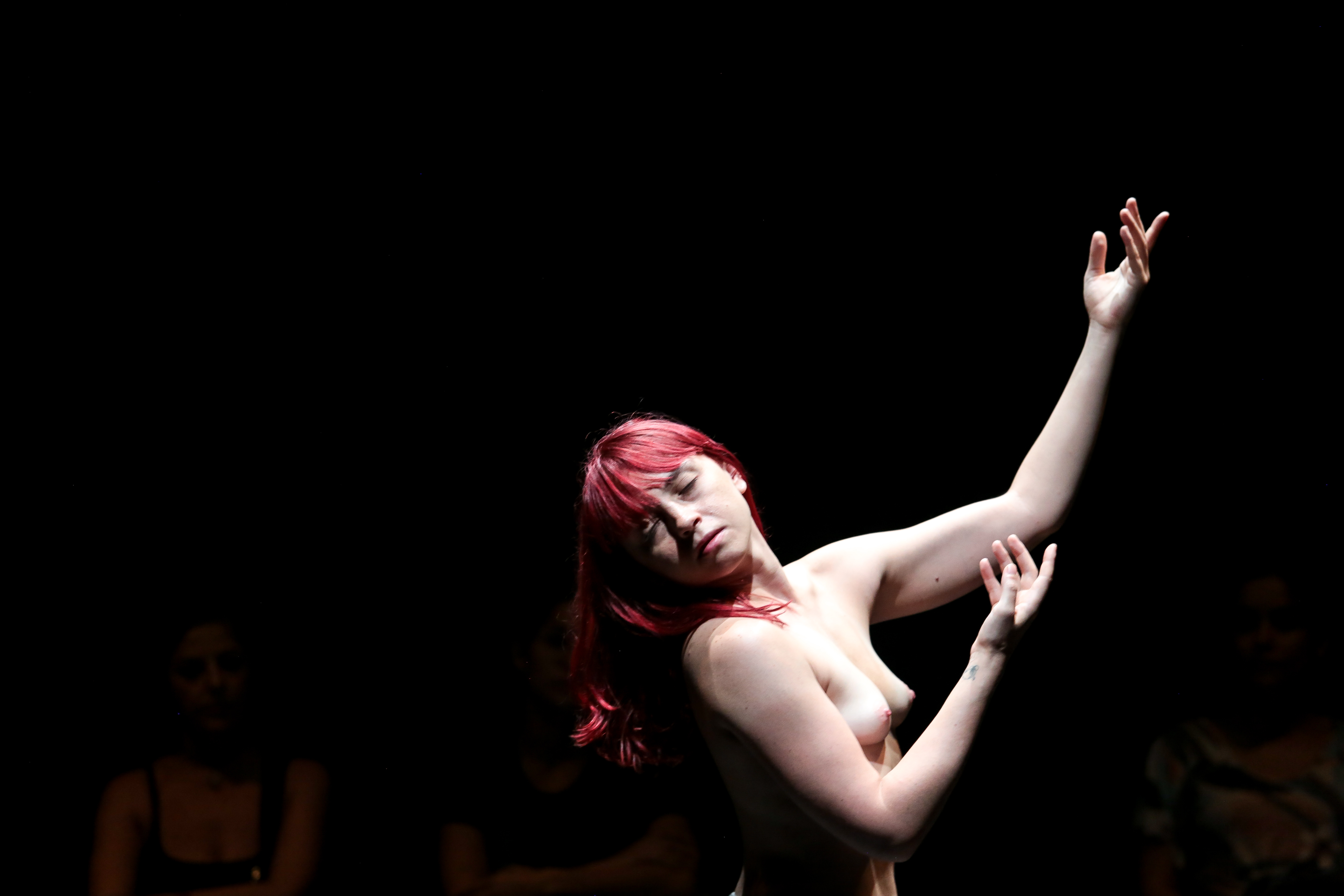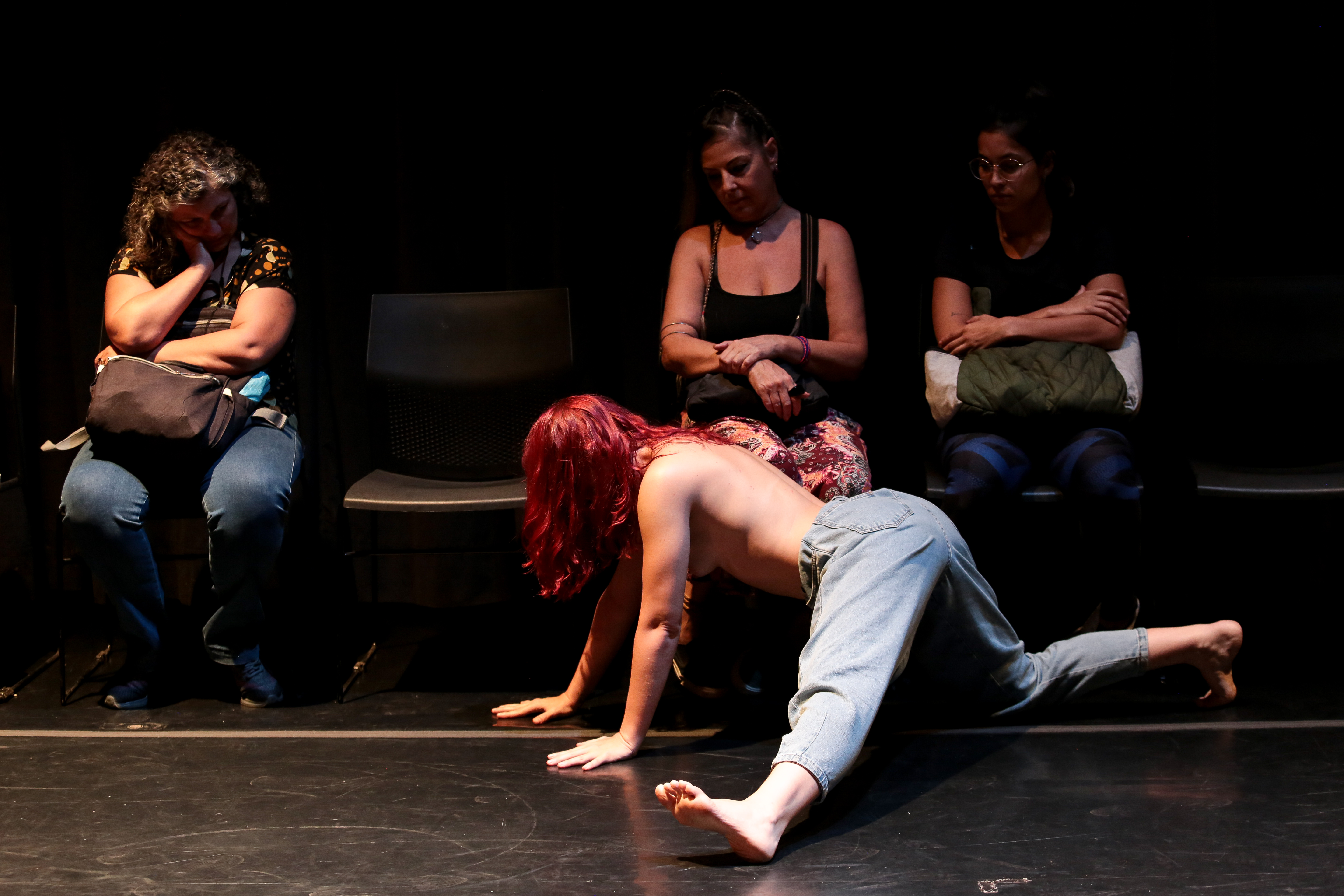 A distribuição do público ao redor da bailarina, seminua, faz alusão a uma experiência de exposição de uma obra de arte, contexto onde o corpo da mulher é contemplado e objetificado sistematicamente, sob um olhar hegemônico, geralmente masculino.